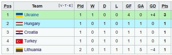 Турнірне становище: Україна (3 очки), Хорватія, Туреччина, Угорщина, Литва (по 1).