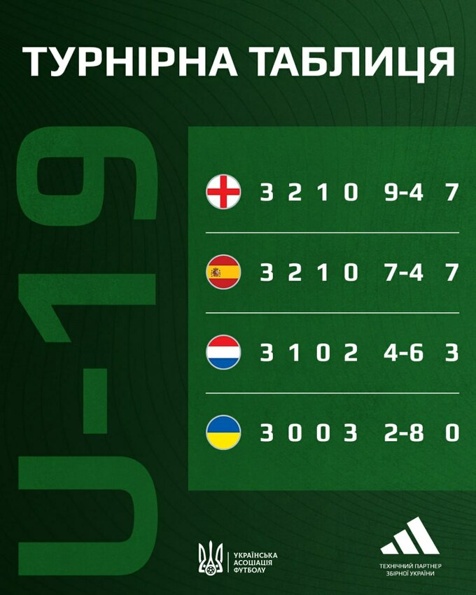 Підсумкове становище: Англія (7 очок), Іспанія (7), Нідерланди (3), Україна (0).