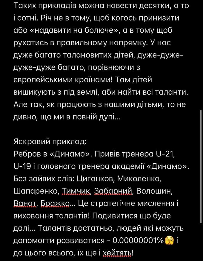 Яскравий приклад – Ребров у «Динамо». Він привів тренера U-21, U-19 і головного тренера академії. Результат без зайвих слів: Циганков, Миколенко, Шапаренко, Тимчик, Забарний, Волошин, Ванат, Бражко... Це стратегічне мислення і виховання талантів! Подивимось, що буде далі. Талантів достатньо, а людей, які можуть допомогти розвиватися, – 0.00000001%. І навіть тих ще й хейтять!