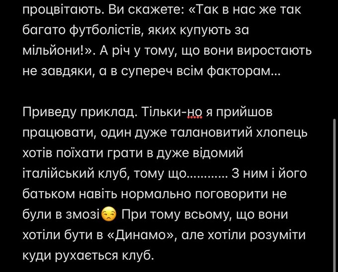 Я можу говорити про всі проблеми «Динамо» Київ годинами або навіть днями. Розказати все в одному пості в Instagram неможливо. Я б хотів «начистоту» поговорити з тими, кому я довіряю й можу відверто розповісти все футбольній аудиторії. Тому що моє «звільнення» навіть звучить смішно! Моя рідна команда, за яку я вболіваю все життя, через яку мої діти плачуть, коли вона програє, повинна змінитися! Те, що там відбувається зараз, – це дорога в Маріанську западину!