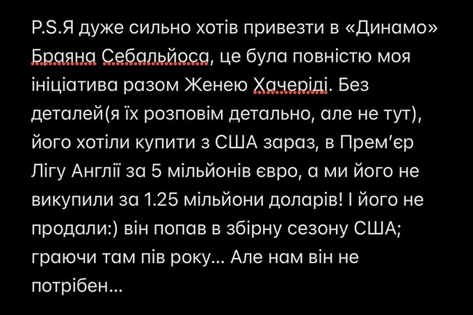 P.S. Я дуже хотів привезти в «Динамо» Браяна Себальоса. Це була повністю моя ініціатива разом із Женею Хачеріді. Без деталей (розповім їх згодом, але не тут). Його хотіли купити з MLS у клуб АПЛ за 5 млн євро. Ми могли викупити його за 1,25 млн доларів – але цього не зробили. І в результаті він потрапив у символічну збірну сезону США, відігравши там лише півроку. Але «Динамо» він не знадобився.