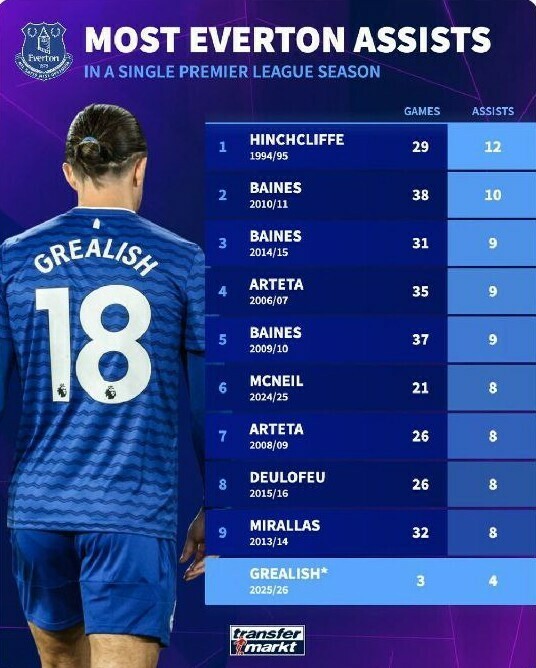 Портал Transfermarkt відреагував на це списком найкращих асистентів «Евертона» в АПЛ за один сезон.
