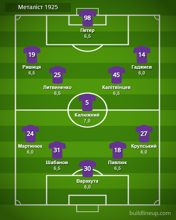 «Металіст 1925»: Варакута – Мартинюк, Шабанов, Павлюк, Крупський – Литвиненко (Чурко, 90+3), Калюжний, Калітвінцев – Рашиця (Мба, 84), Петер (Когут, 71), Гаджиєв (Арі, 84).