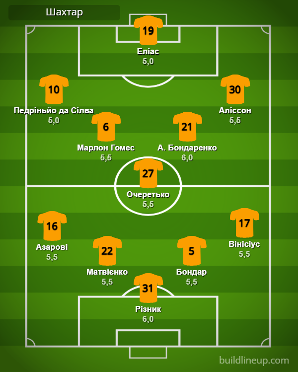 «Шахтар»: Різник – Азарові (Конопля, 75), Матвієнко, Бондар, Вінісіус – Марлон Гомес (Криськів, 65), Очеретько, Бондаренко – Педріньйо да Сілва, Еліас (Невертон, 65), Аліссон.
