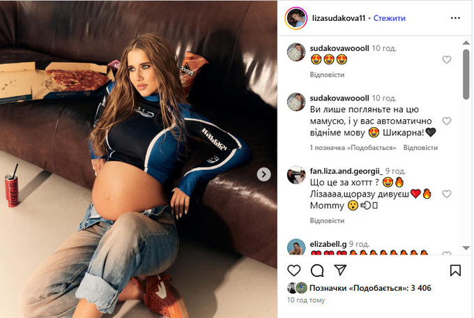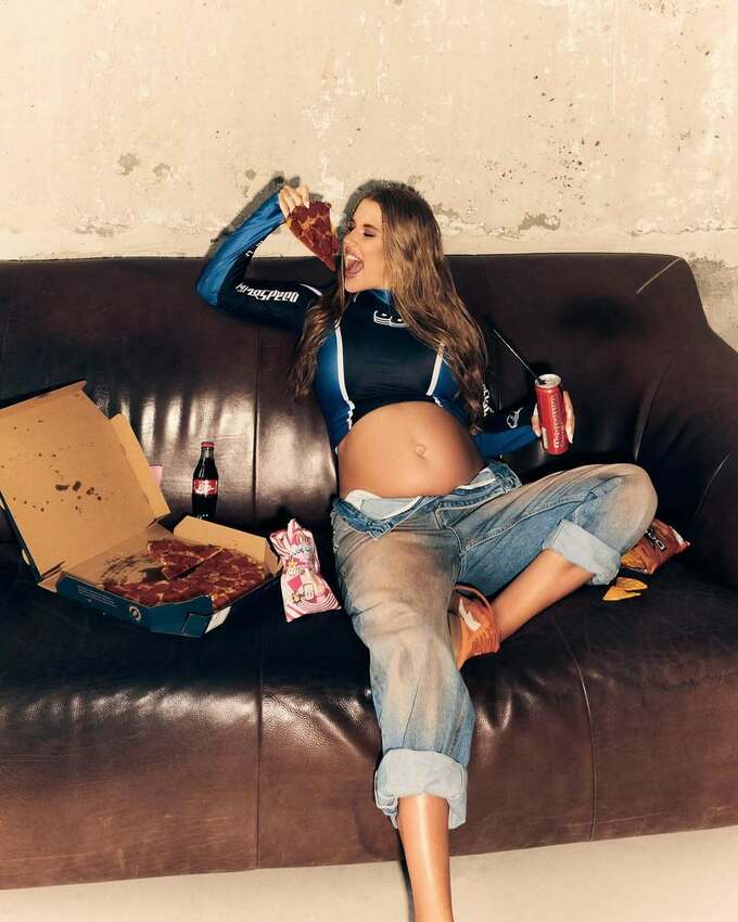 Вагітна Судакова позує в спортивному топі і розстібнутих джинсах з піцою, чіпсами і банкою Coca-Cola поруч, демонструючи жіночність і впевненість.