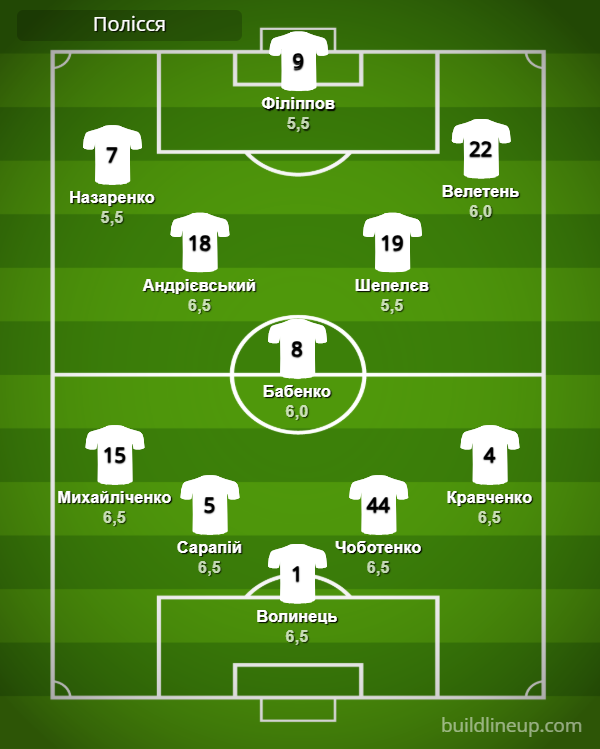 «Полісся»: Волинець – Михайліченко (Майсурадзе, 90+2), Сарапій, Чоботенко, Кравченко – Андрієвський (Борел, 84), Бабенко, Шепелєв (Йосефі, 63) – Назаренко (Брагару, 63), Філіппов (Гайдучик, 63), Велетень.