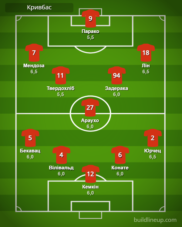 «Кривбас»: Кемкін – Бекавац, Вілівальд, Конате, Юрчец – Твердохліб, Араухо, Задерака – Мендоза (Каменський, 83), Парако (Я. Шевченко, 83), Лін (Микитишин, 64).