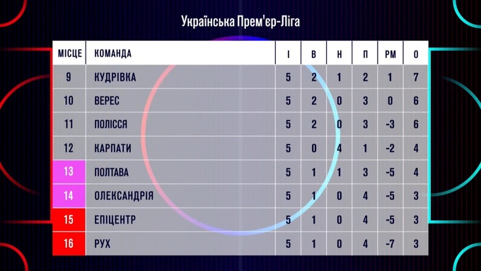 На дні турнірної таблиці знаходяться Епіцентр, Олександрія та Рух (по 3 очки).