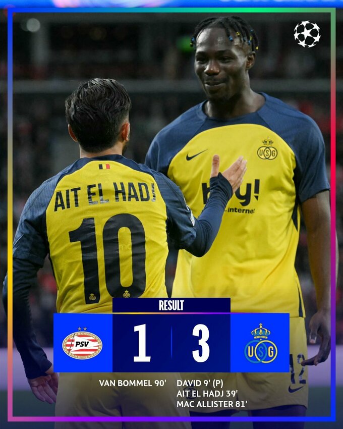 | 1 | Юніон Сент-Жілуаз | 1 | 1 | 0 | 0 | 3 - 1 | 01.10.25 19:45 Юніон Сент-Жілуаз - Ньюкасл16.09.25 ПСВ Ейндховен 1:3 Юніон Сент-Жілуаз | 3 | |