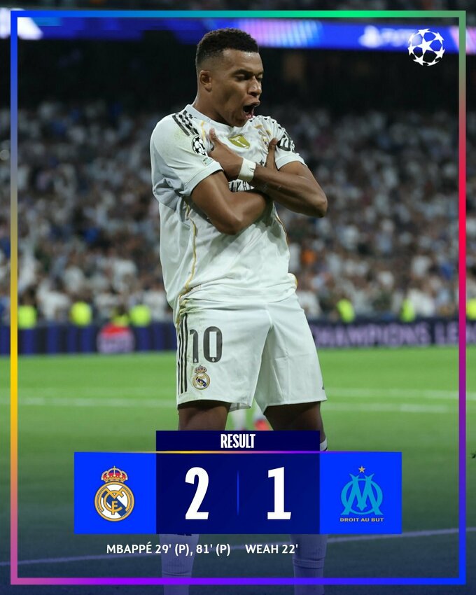 Дубль Кіліана Мбаппе приніс перемогу мадридському Реалу над Марселем із Франції (2:1).
