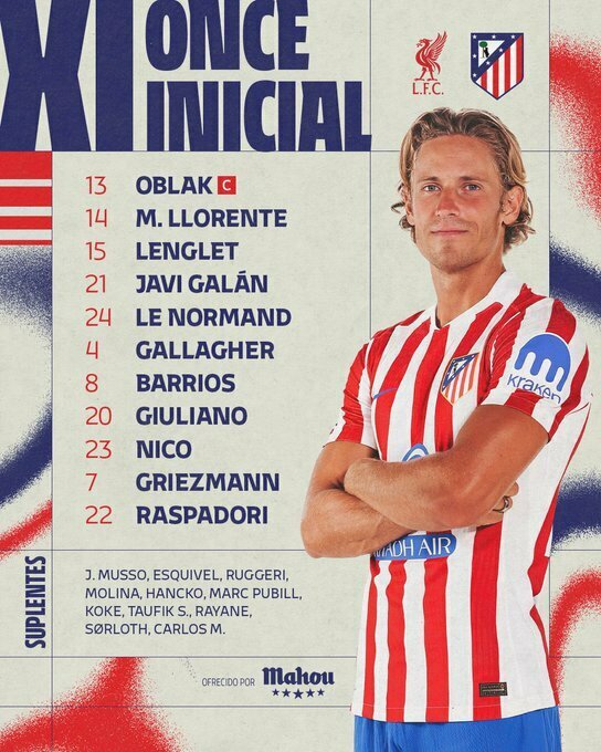 «Атлетіко»: Облак – Галан, Ленгле, Ле Норман, Льоренте – Гонсалес (Пубіль, 76), Галлагер (Моліна, 61), Барріос, Сімеоне – Грізманн (Серлот, 61), Распадорі (Коке, 53).