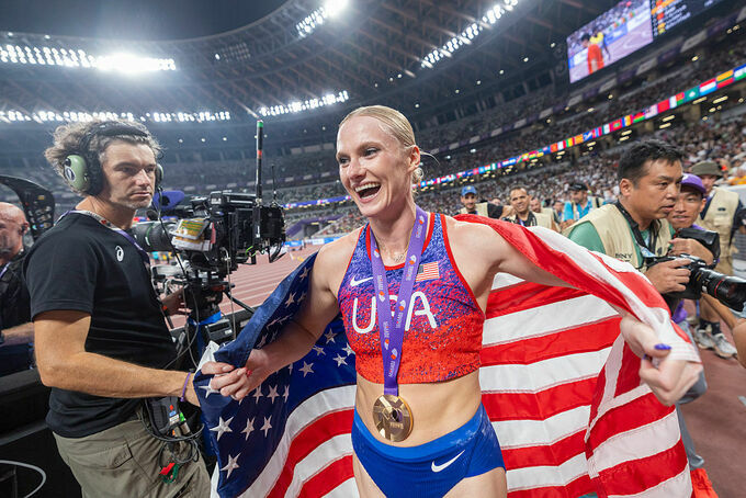 34-річна американка Кейт Мун втретє поспіль виграла золото чемпіонату світу зі стрибків з жердиною.