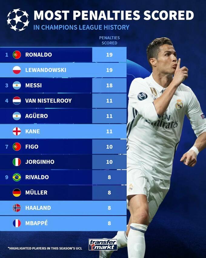 Нині лідерство за цим показником ділять Левандовськи та Кріштіану Роналду – 19 голів з пенальті. На третій позиції розташувався Ліонель Мессі з 18 реалізованими 11-метровими ударами.