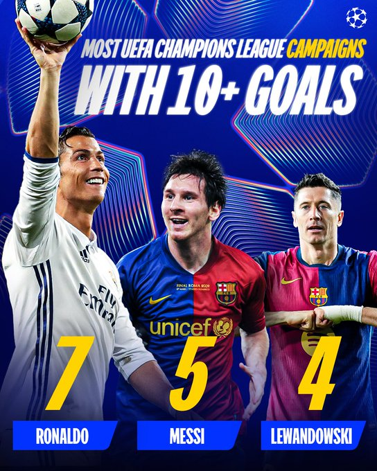 Форвард «Барселони» Роберт Левандовськи вже у нинішньому розіграші Ліги чемпіонів матиме можливість зрівнятися з Ліонелем Мессі за кількістю кампаній змагання з 10+ голами.