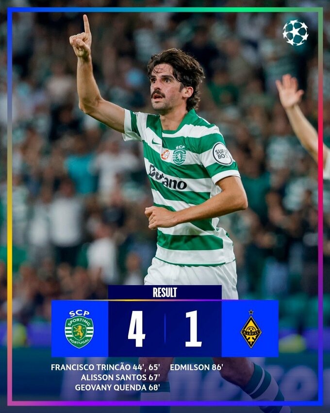 | 3 | Спортінг Лісабон | 1 | 1 | 0 | 0 | 4 - 1 | 01.10.25 22:00 Наполі - Спортінг Лісабон18.09.25 Спортінг Лісабон 4:1 Кайрат | 3 | |
