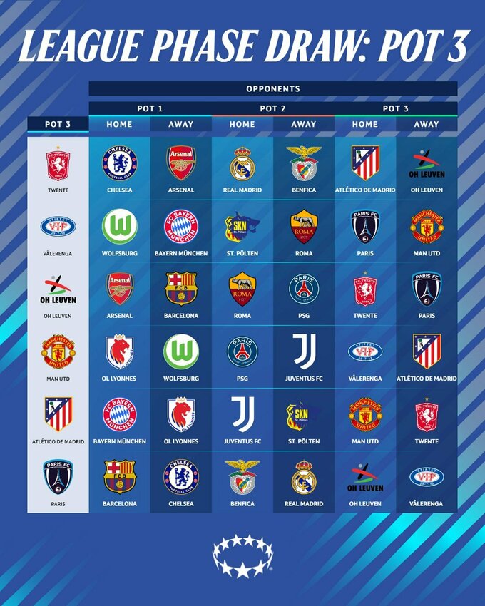 🔹 Кошик 3: Твенте (Нідерланди), Волеренга (Норвегія), Париж (Франція), Манчестер Юнайтед (Англія), Атлетіко Мадрид (Іспанія), Левен (Бельгія)