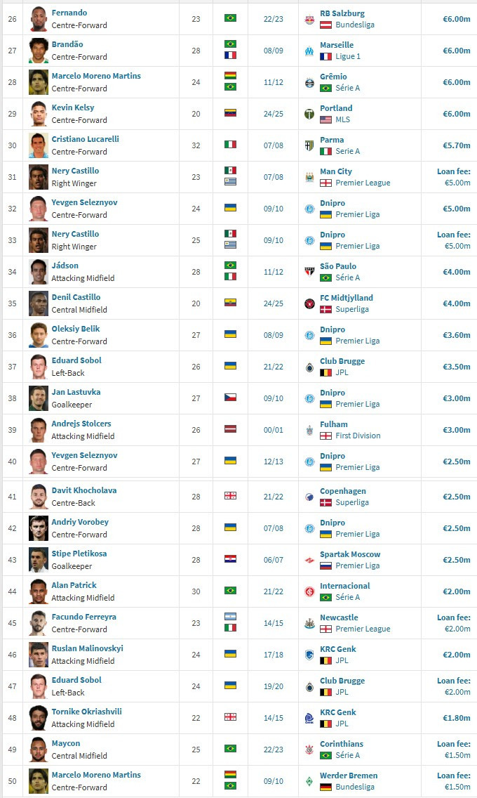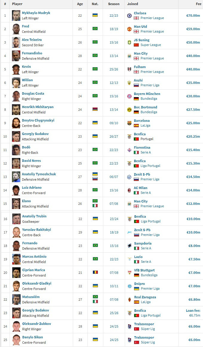 Останнім подібним продажем став трансфер Кевіна до «Фулгема» за 40 млн євро. Найдорожчою угодою в списку став перехід Фреда до лав «Манчестер Юнайтед» – 59 млн.