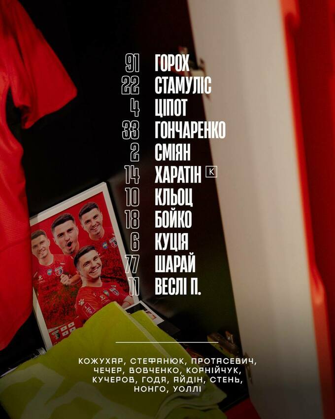 Запасні: Кожухар, Стефанюк, Протасевич, Чечер, Вовченко, Годя, Айдін, Нонго, Воллі.
