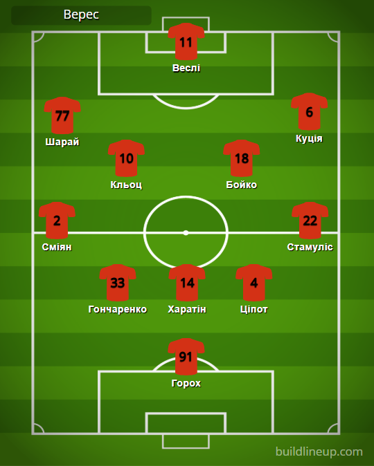 «Верес»: Горох – Сміян, Гончаренко, Харатін, Ціпот, Стамуліс – Шарай (Корнійчук, 88), Бойко, Кльоц (Кучеров, 37), Куція – Веслі (Стень, 69).