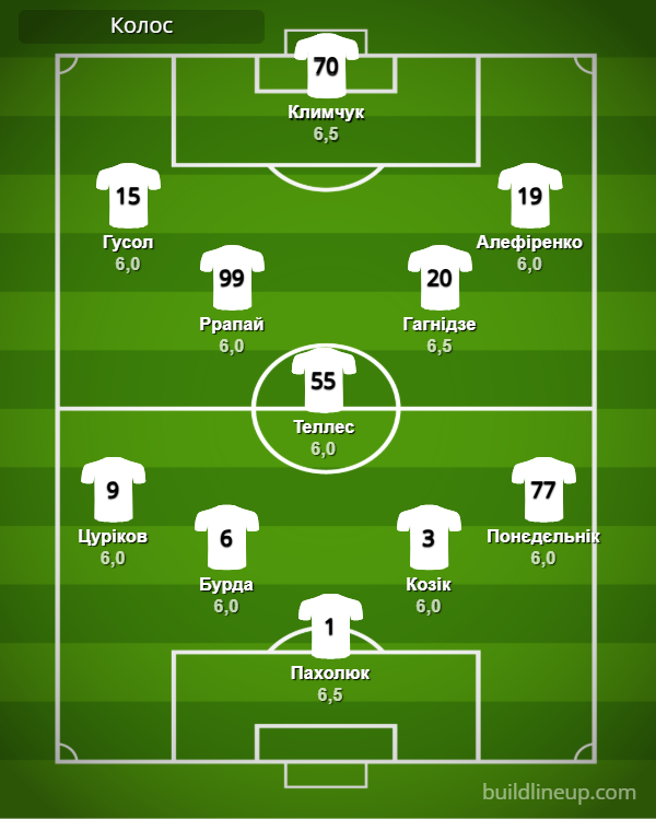 «Колос»: Пахолюк – Цуріков, Бурда, Козік (Бондаренко, 87), Понєдєльнік – Ррапай (Салабай, 87), Теллес, Гагнідзе – Гусол (Кане, 69), Климчук (Оєвусі, 69), Алефіренко (Третьяков, 68).