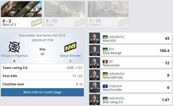 На Nuke зустріч вийшла доволі напруженою, але NAVI зуміли перехопити ініціативу та закрили мапу – 13:9. На Inferno боротьба була ще жорсткішою: NiP намагалися зачепитися за камбек, проте вирішальним став клатч від Валерія «b1t» Ваховського, який на еко-раунді оформив мінус чотири з Desert Eagle. Після цього «народжені перемагати» розігналися й добили суперника – 13:7.