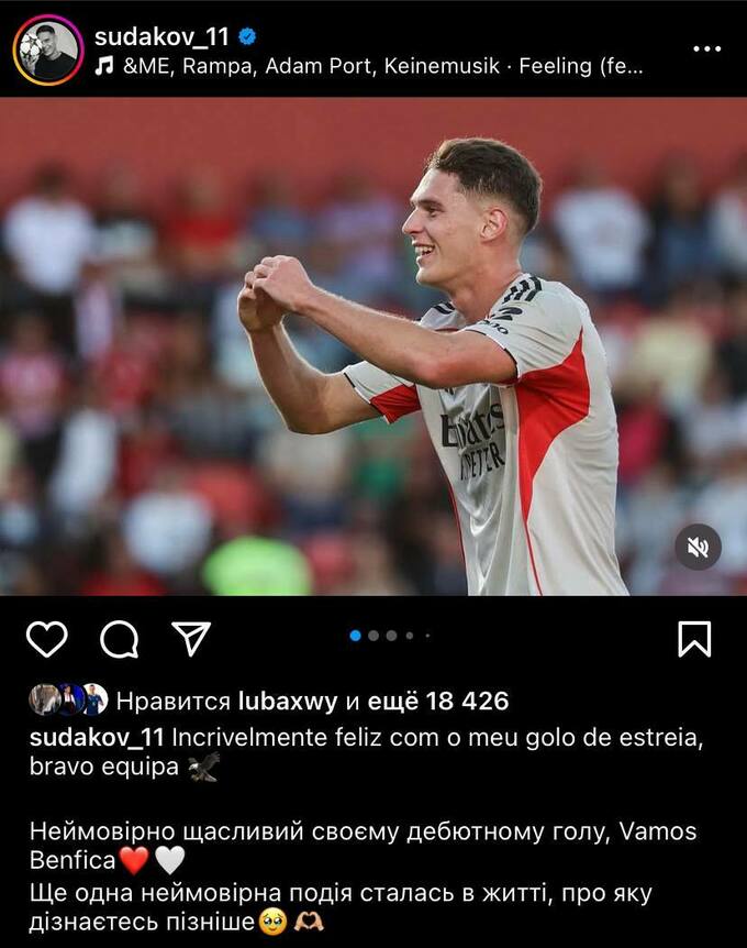 «Неймовірно щасливий своєму дебютному голу, Vamos Benfica❤️🤍Ще одна неймовірна подія сталась в житті, про яку дізнаєтесь пізніше», – написав Судаков.