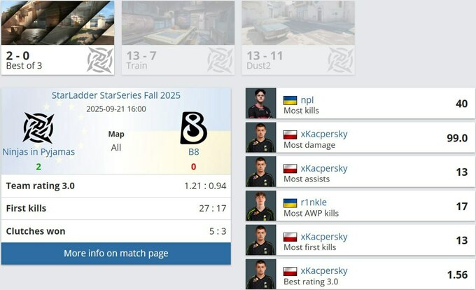 На першій мапі (Train) B8 програвали 0:10, але зуміли частково повернутись у гру. Проте втрата великої кількості раундів у першій половині виявилася критичною – NiP закрили карту з рахунком 13:7.