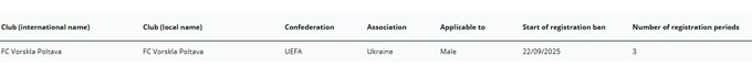 Полтавська «Ворскла» отримала черговий трансферний бан від ФІФА – інформація про покарання від Міжнародної федерації футболу з'явилася в офіційному списку клубів, яким заборонено реєструвати нових гравців.