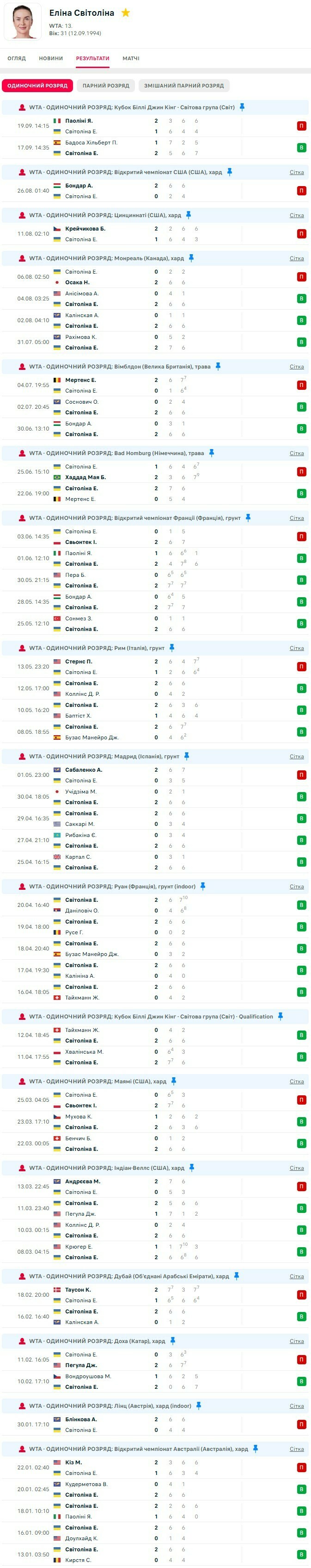 31-річна українська тенісистка Еліна Світоліна (WTA 13) у своєму Instagram повідомила, що достроково завершила сезон.