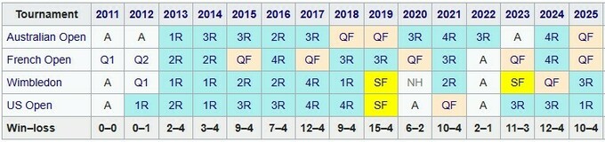 Що стосується турнірів Grand Slam, то на Australian Open і Ролан Гаррос вона дійшла до чвертьфіналів. Вімблдон Еліна залишила в третьому раунді, а US Open – у другому.