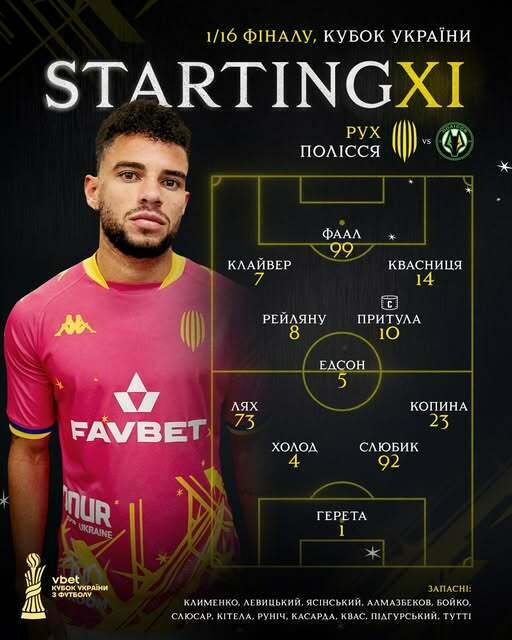 «Рух»: Герета – Лях, Холод, Слюбик, Копина – Едсон, Притула (Підгурський, 85), Рейляну (Слюсар, 60) – Клайвер (Руніч, 85), Фаал (Тутті, 85), Квасниця (Алмазбеков, 68).