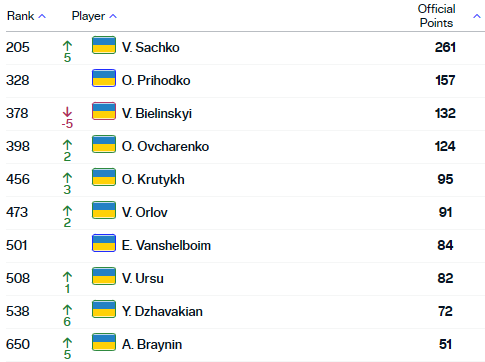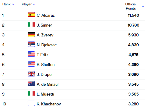 У першій десятці ніяких змін не відбулося. Першим йде Карлос Алькарас, слідом за ним розташований Яннік Сіннер – розрив становить 760 очок. У топ-5 також знаходяться Олександр Звєрєв, Новак Джокович і Тейлор Фріц.
