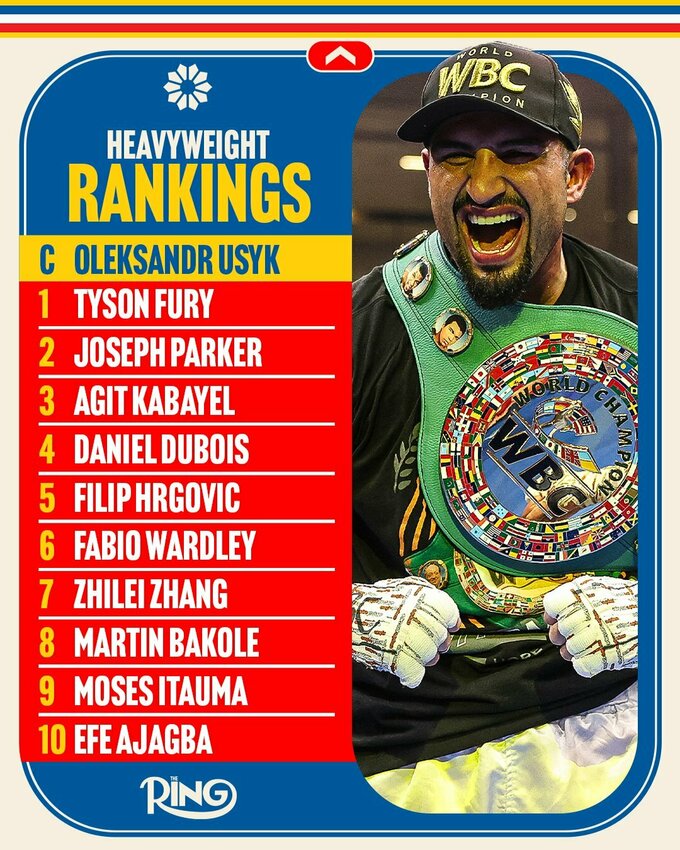 Чемпіонський пояс видання належить Олександру Усику. Попри завершення кар’єри, Тайсон Ф’юрі зберіг за собою першу позицію. Друге місце посідає Джозеф Паркер, а третє — Агіт Кабаєл.