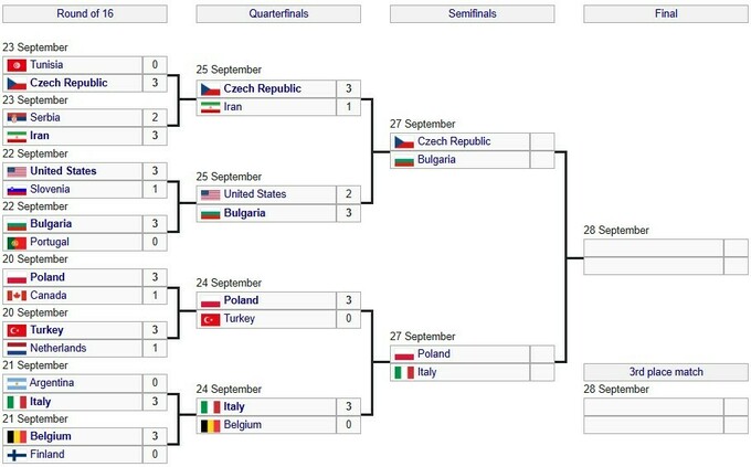 У четвер, 25 вересня, завершився етап 1/4 фіналу чемпіонату світу з волейболу серед чоловіків. За останні два дні було зіграно чотири поєдинки, які визначили повний склад півфіналістів турніру. Першими путівки вибороли Італія та Польща, а в заключний ігровий день за право до них приєдналися змагались: Чехія та Іран, а згодом США та Болгарія.