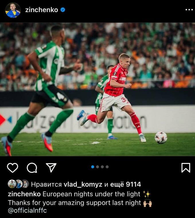 Після матчу Зінченко лаконічно поділився емоціями від результативної нічиєї у першому турі основного етапу Ліги Європи, опублікувавши допис в instagram.