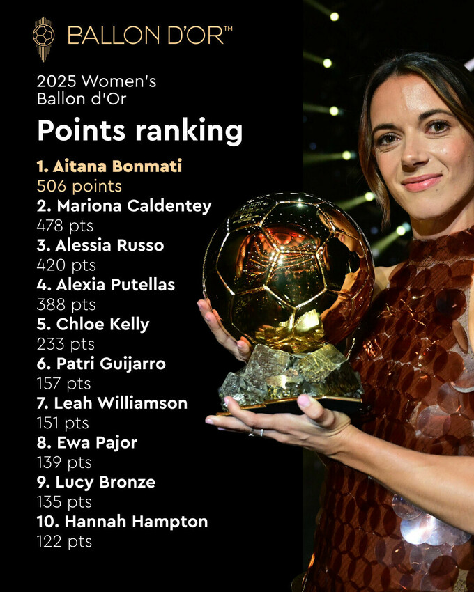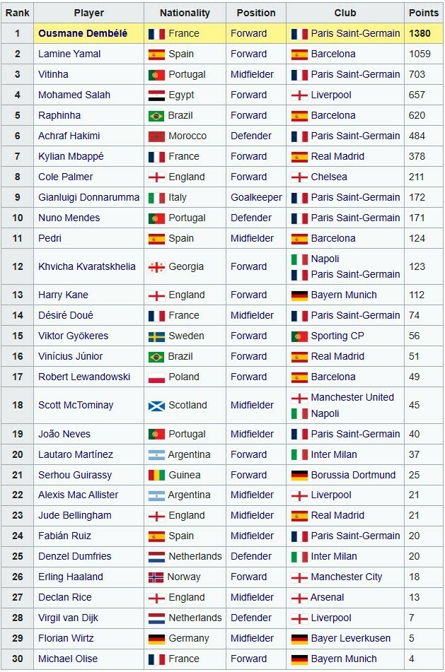 Золотий м'яч 2025: повний підсумковий рейтинг