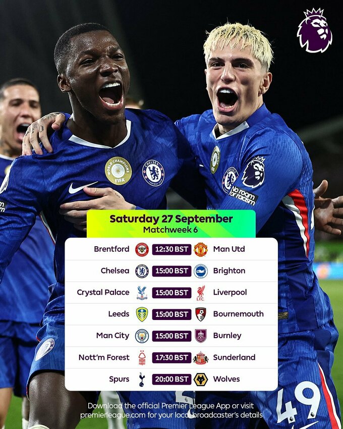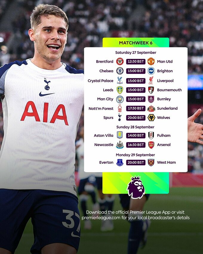 6-й тур відбудеться з 27 по 29 вересня, центральний матч: Ньюкасл – Арсенал.