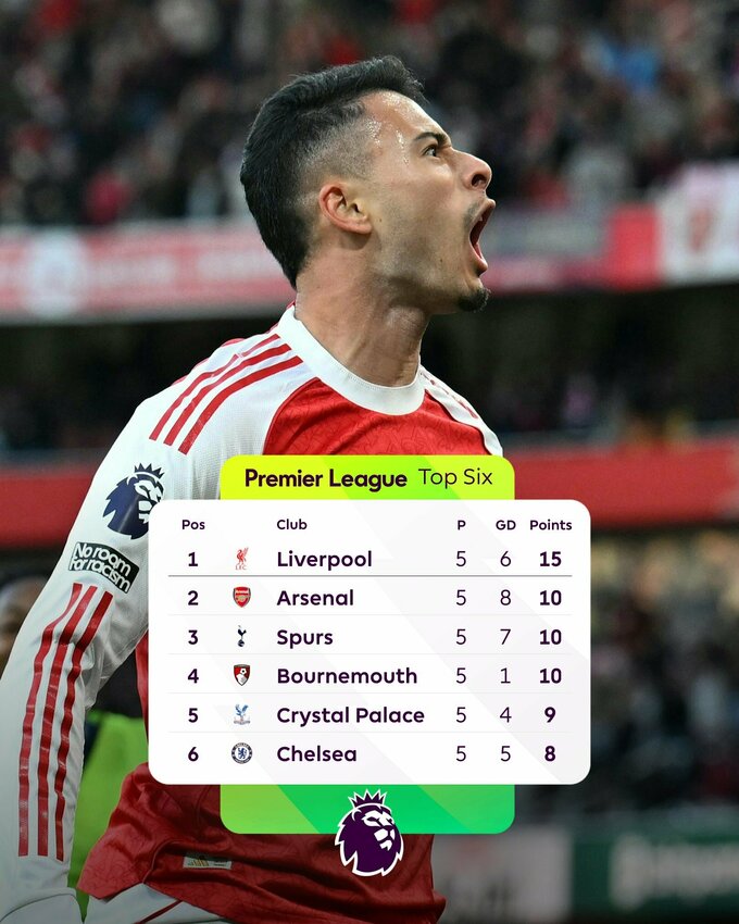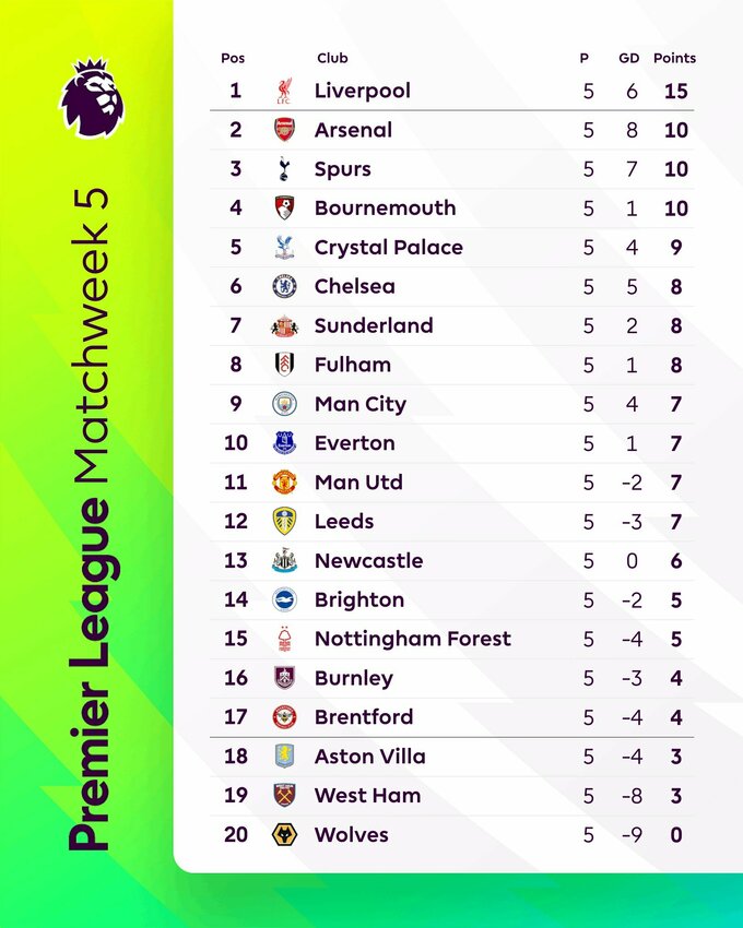 На вершині турнірної таблиці перебувають: Ліверпуль (15), Арсенал, Тоттенхем, Борнмут (по 10).