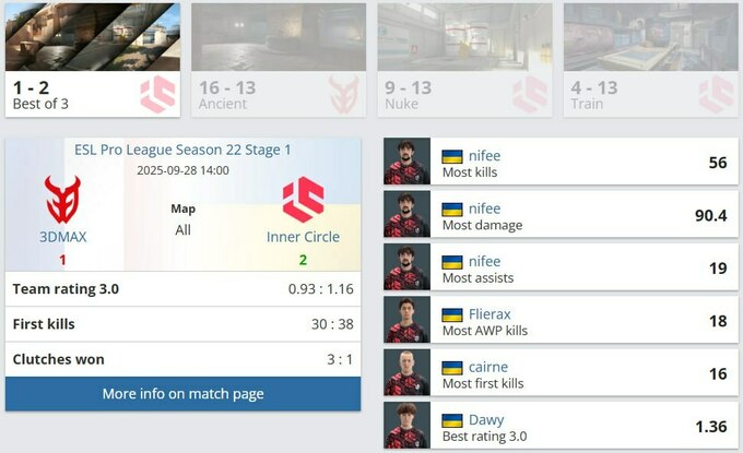 Український склад Inner Circle, який нещодавно грав під прапором TNL, успішно стартував на ESL Pro League Season 22. У дебютному матчі колектив здолав 3DMAX, для яких це протистояння видалося непростим.