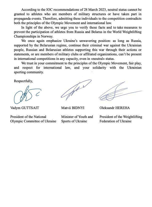 Звернення підписали президент НОК України Вадим Гутцайт, Міністр молоді та спорту України Матвій Бідний та президент Федерації важкої атлетики України Олександр Герега, які вкотре наголосили на незмінній позиції України: доки триває війна проти нашої держави, спортсмени, які підтримують агресію діями чи словами, або є частиною військових і пропагандистських структур, не можуть брати участі у міжнародних змаганнях у будь-якому статусі.