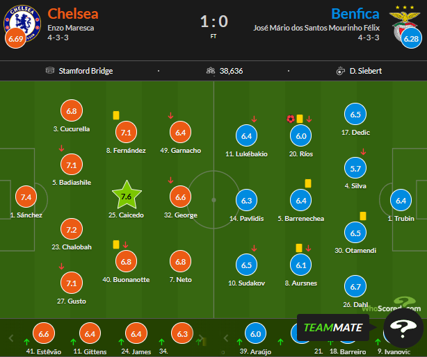 Найращим гравцем зустрічі за версією WhoScored став хавбек пенсіонерів Мойсес Кайседо (7,6). Найращий у складі Бенфіки – Самуель Даль (6,7).