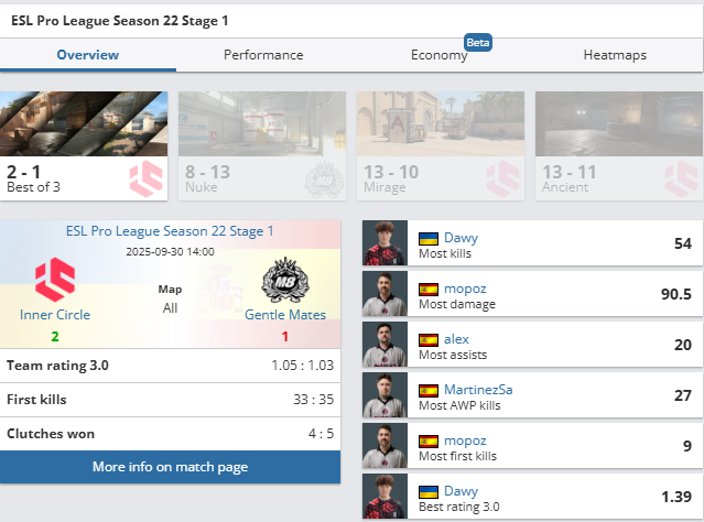 Українська команда Inner Circle забезпечила собі вихід до другого етапу ESL Pro League Season 22 з рахунком 3-0 по матчах та завдала серйозного удару по шансах Gentle Mates у боротьбі за важливі VRS-очки у гонці до Мейджора.