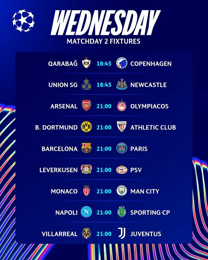 Увечері 1 жовтня відбуваються матчі 2-го туру Ліги чемпіонів УЄФА 2025/26