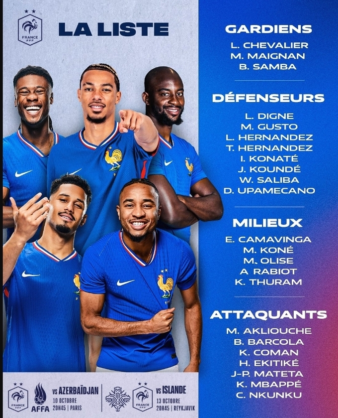 Наставник збірної Франції Дідьє Дешам оголосив заявку національної команди на матчі відбору ЧС-2026 проти Ісландії (10 жовтня) та Азербайджану (13 жовтня).