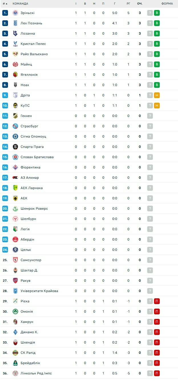 1-й тур Ліги конференцій. Перший блок матчів: фіаско Динамо, таблиця