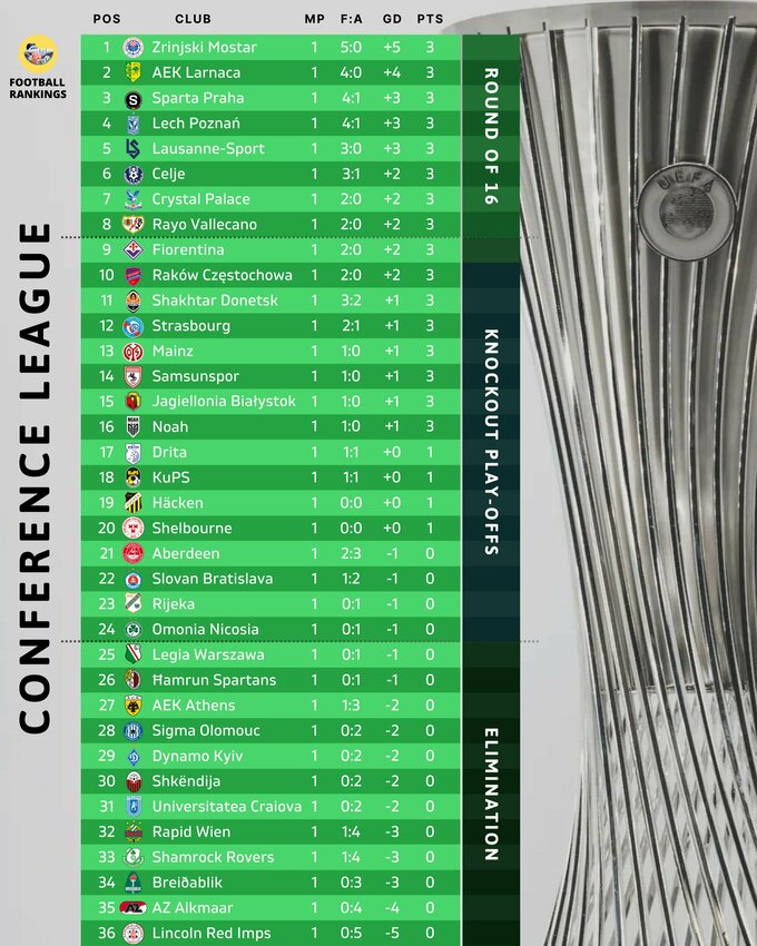 | 36 | Лінкольн Ред Імпс | 1 | 0 | 0 | 1 | 0 - 5 | 23.10.25 22:00 Лінкольн Ред Імпс - Лех02.10.25 Зриньски 5:0 Лінкольн Ред Імпс | 0 |