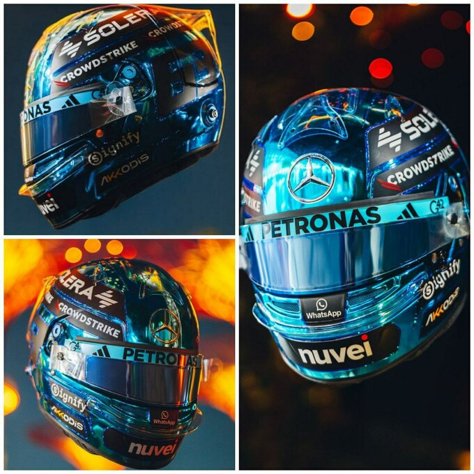 Останнім свій шолом у соцмережах представив Джордж Расселл із Мерседеса. Британський пілот майже не відходив від свого звичного дизайну, залишивши основний блакитний колір але зробив його хромовим і додавши лише невеликі зміни, що підкреслюють індивідуальність та роблять шолом трохи свіжішим для Гран-прі Сінгапуру.