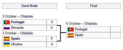 У півфіналах 3 жовтня Іспанія переграла Україну (7:4), а Португалія взяла гору над Словенією (3:0).