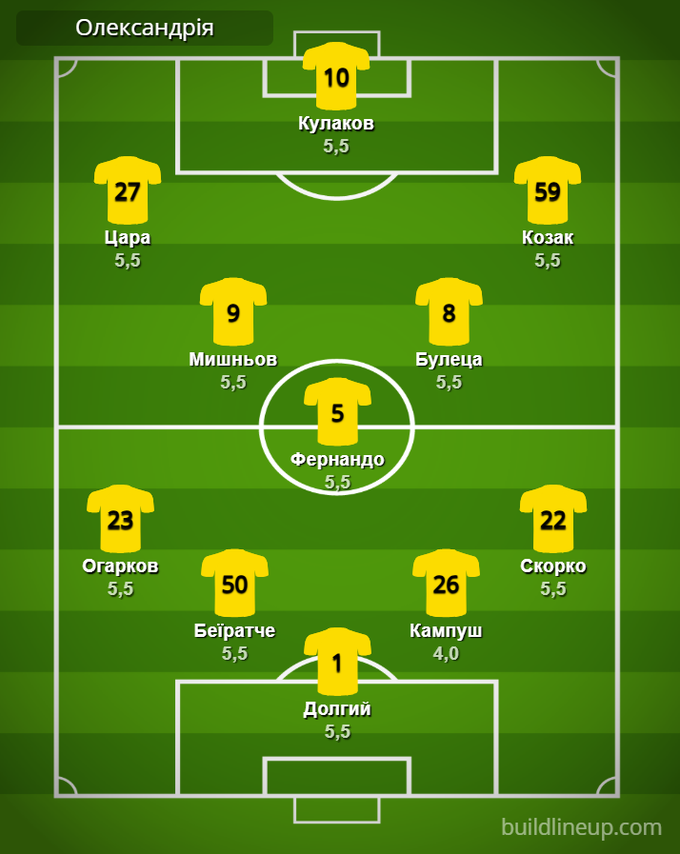 «Олександрія»: Долгий – Огарков (Ндіка, 78), Беїратче, Кампуш, Скорко (Шулянський, 88) – Мишньов, Фернандо, Булеца – Цара (Жота, 78), Кулаков (Кастільйо, 65), Козак (Жонатан, 65).