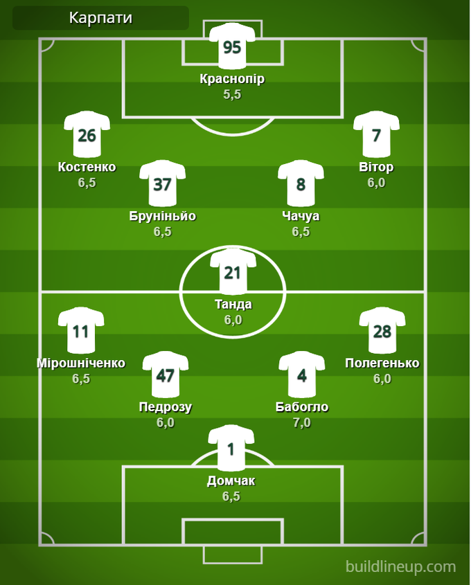 «Карпати»: Домчак – Мірошніченко, Педрозу, Бабогло, Полегенько – Бруніньйо (Федор, 90+2), Танда (Адамюк, 75), Чачуа (Альварес, 75) – Костенко (Фабі, 75), Краснопір (Ігор, 52), Вітор.